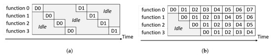 FPGA development often involves balancing between the performance and the resource use of the design. Unlike processor systems, where the execution of an algorithm is directed by the software, in FPGAs different physical parts of a chip can be dedicated to a specific task. These parts can be interconnected, enabling a special kind of concurrency-pipeline. Pipelining is an important technique to increase the system’s performance by overlapping the processing of several tasks [33]. A fully pipelined solution can accept new input data on every clock cycle, and it is characterized by a fixed latency. The term Initiation Interval (II) denotes the number of clock cycles between consecutive input transactions. Conceptual examples of non-optimized and optimized processing pipelines are shown in Figure 2a,b, respectively. In these figures, functions represent different hardware blocks and DX denotes data samples.