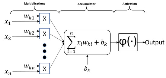 By using the NNs structure, it is possible to derive the number of fundamental operations for each layer depending on its input and output count. Let , , , , be the number of inputs, outputs, adders, multipliers and activation function operations, respectively. The number of multipliers and adders corresponding to a fully pipelined implementation for a neuron is shown in Equation (1) and for each layer in Equation (2), respectively.