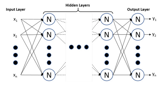 A type of frequently used NN is constructed by arranging neurons in layers where all the neurons in every layer connect to each neuron in the adjacent forward layer, i.e., fully connected FFNN. This type of network is illustrated in Figure 4.