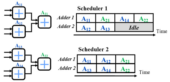 As for the neuron’s summation model, all the inputs of a neuron are summed up together (bias is treated as one of the inputs), which results in potential inter-dependencies for adders. Furthermore, depending on the clock frequency, chosen data type and routing, multiple distinct adder chains can be joined for processing in a single clock cycle. Nevertheless, for the convenience, we adopt a simpler addition-per-period model. Another important consideration is the complexity of adder scheduling, as different resource sharing arrangements can lead to different delay characterization. This is illustrated in Figure 5. Notably, many FPGAs employ a multiply-accumulate circuit in their DSP blocks; nevertheless, their use restrains the pipelining characteristics of the overall design.