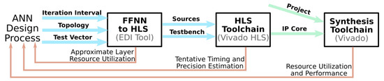A tool has been designed to automate the implementation of different networks, which takes FFNN topology as an input and generates C++ code for Xilinx HLS. The tool is based on the following methodology. First, the network topology is split into “elementary” layers, where each layer can be characterized by a specific resource, i.e., adder, multiplier, activation function, normalization function. Resource sharing is accomplished with multiplexing logic as shown in Figure 7. The implementation of this logic is managed by the HLS tool. Second, the network delay model is derived. This information enables the latency calculation for each elementary layer and determines the made choices regarding the FFNN’s pipeline. Each layer’s delay decreases by increasing the number of its allocated resources. In an optimal pipeline, all layers should have the same delay. This principle persists throughout throughput optimization calculations. The developed tool can be integrated into a larger workflow, e.g., as a part of CNN’s classifier design. This is illustrated in Figure 8.
