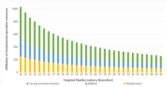 One of the tool’s main parameters which steer the code generation process is the maximum acceptable delay (expressed in clock cycles) for each stage of the pipeline. This parameter enables allocating “just enough” resources to comply with the given constraint-pipeline’s initiation interval. An example of such a resource relationship is shown in Figure 9, where the same FFNN topology is fed into the developed tool while targeting a range of initiation intervals. Furthermore, the developed tool supports different normalization, addition, multiplication and activation layers and can easily extend to incorporate new calculations or operations described with LUTs. For example, activation function can be calculated analytically by using Xilinx and LOGICore IPs or by implementing it in a LUT. Nevertheless, when using Xilinx IP cores, the user should check the core’s support for the targeted data type.