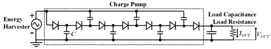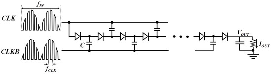 Various circuit designs [8,9,10,11] have been proposed and developed for vibration EH (vEH). In Reference [8], an AC-DC charge pump (CP), which has been used for RF energy harvesting and radio frequency identification (RFID), is used for vEH as well. CP is a boosting circuit in which charges are transferred from one capacitor to the next by inputting a clock signal. Input AC voltage is also treated as a clock, as shown in Figure 1.