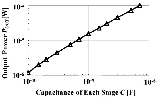 Accordingly, as the frequency of the AC input voltage increases, the output current of CP () increases. In Reference [8], four discrete germanium Schottky barrier diodes and three chip capacitors with 1 μF each were built. AC-DC CPs have been integrated in RFID at HF or RF bands, as discussed in [12,13]. Conversely, AC-DC CPs have never been integrated in a chip for vEH because of its low frequency. When the capacitance per stage C is increased, the amount of charge that can be charged and discharged at one time increases, and thus increases even at a low frequency. Figure 2 shows a simulated relationship between C of AC-DC CP and output power POUT.