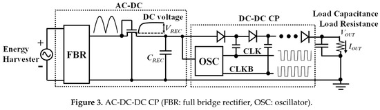 Let us assume the power supply of the sensor requires 2 V and at least 1 μW at 2 V. When the input voltage amplitude VDD = 0.5 V and VOUT = 2 V, C of 700 pF is required to obtain POUT of 1 μW. If the AC-DC CP is integrated using metal-insulator-metal (MIM) capacitors with capacitance density of 2 fF/μm2, the circuit area would be as large as 3 mm2, and POUT per area is 0.3 μW/mm2 when the number of stage is 9 and the AC frequency is 1 kHz. Such a design solution would be practically impossible for low-cost small form factor IoT edge devices. To solve the problem, AC-DC-DC conversion has been proposed and developed [9,10], which includes AC-DC conversion followed by DC-DC conversion using a CP (see Figure 3).
