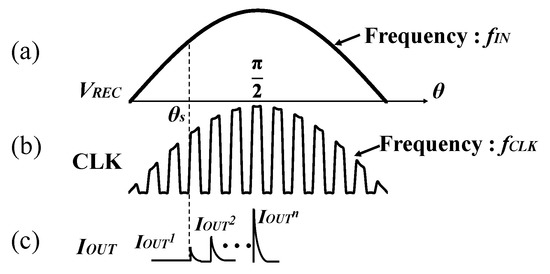 Figure 6 shows the waveforms of voltage and current in the proposed circuit. The input voltage is a sine wave with an amplitude of VDD. θS is defined by the phase in which an average output current at θ, IOUT(θ), starts to flow. IOUT(θ) varies in amplitude according to the clock amplitude. Assuming that fCLK is much higher than fIN, the amplitudes at the rising and falling edges can be considered to be the same. Therefore, IOUT(θ) is obtained by applying the IOUT-VOUT equation of the DC-DC charge pump [16].