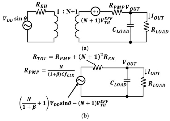 where N is the number of capacitors, β is the ratio of the parasitic capacitance to the pump capacitor C, is the effective threshold voltage of the diode given by Equation (2) [16], and RTOT is the output impedance of the entire system including ET and CP given by Equation (3) [17].