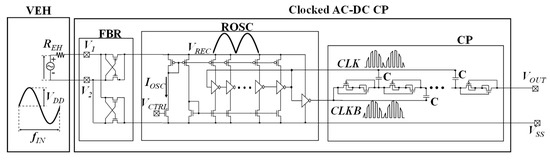 - Kawauchi, H.; Tanzawa, T. A 2V 3.8 µW Fully-Integrated Clocked AC-DC Charge Pump with 0.5 V 500 Ω Vibration Energy Harvester. In Proceedings of the IEEE Asia Pacific Conference on Circuits and Systems, Bangkok, Thailand, 11–14 November 2019; pp. 329–332. [Google Scholar]
