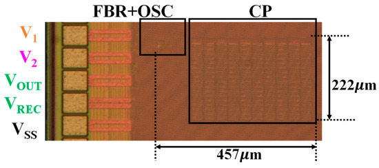 Figure 10 shows a chip micrograph. The total area of the whole circuit is about 0.11 mm2. This size is small enough to fit in sensor ICs. The measured waveforms are shown in Figure 11, where ROUT and COUT were 1 MΩ and 300 nF, respectively. V1–V2 is the input differential voltage to the circuit. VREC is the supply voltage of CP and ROSC. Figure 11b shows focused clock waveform. Figure 11c shows the input and output voltages. The input voltage amplitude was 0.5 V while the output voltage VOUT was about 2 V, indicating that the designed CP was functional as expected. POUT was about 4 μW.