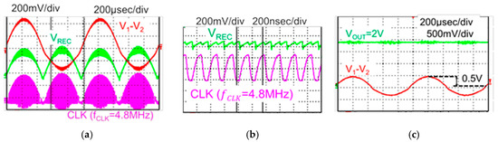 Measured waveforms (a) V1–V2, VREC and CLK, (b) CLK and VREC, (c) V1−V2 and VOUT.