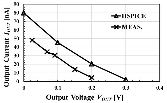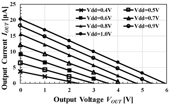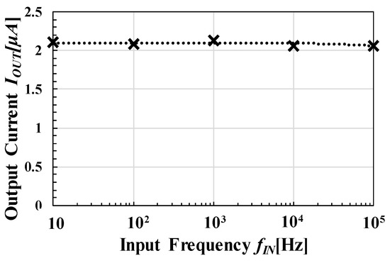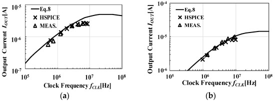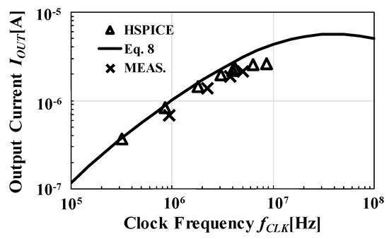 IOUT was measured with fCLK and varied from 1 MHz up to about 5 MHz for a fabricated circuit and from 300 kHz up to about 8 MHz for a simulated one under VDD = 0.5 V, VOUT = 2 V, and fIN = 1 kHz, as shown in Figure 12. The simulated and calculated values agreed within an error rate of 5% for fclk ≤ 1 MHz. As shown in Figure 11b, actual clock waveform had finite rise and fall times, which were ignored in the model equations. Therefore, the actual critical frequency to maximize was lower than that with the model. As a result, the error increased at higher frequencies. The error rate between measured and calculated values was about 10%–40%. The frequency was saturated in the region of fCLK ≥ 5 MHz.