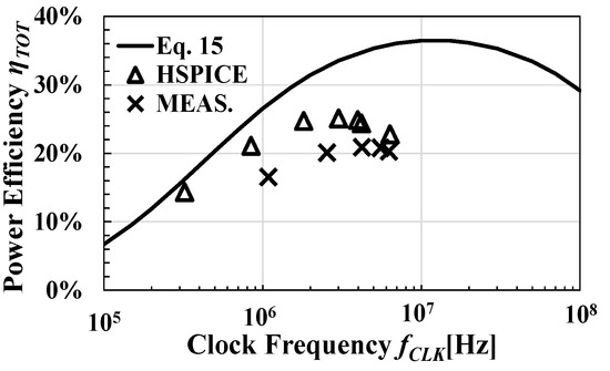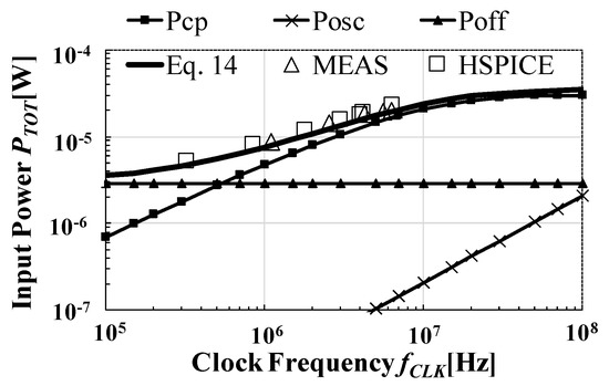 Figure 13 shows PTOT across fCLK on the basis of the model (Equation (14)), measured (MEAS), and simulation (HSPICE). The error rate between the model (Equation (14)) and the simulation value was about 3–30%, and the error rate between the measured value and Equation (14) was about 5–15%. PTOT also increased as fCLK. Figure 13 includes each contributor to Equation (14): PCP, POSC, and POFF as well. POFF became dominant at fCLK < 500 kHz in this design. Such a corner frequency strongly depends on Vt of the switching transistors. As Vt decreased, both POFF and POUT and thereby PIN increased. The calculation result shows that started to decrease at fCLK = 6 MHz. Since there was a power loss POFF = 2.85 μW independent of fCLK, PTOT in the low frequency region converged to 2.85 μW.