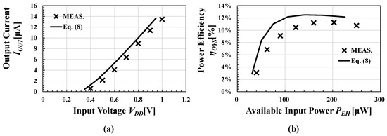 Figure 14 shows ηTOT across fCLK. Since of the measured values was lower than the simulation values in the range of fCLK < 4 MHz, the measured values of ηTOT within the same range were also lower. The efficiency of the measured values was about 23% at the maximum. Compared with the conventional system shown in Figure 1, the power for ROSC was required, and thus the power efficiency was reduced compared with the conventional circuit. Figure 15 shows the relationship between and VOUT for VDD of 0.4–1.0 V. ROSC was not able to run at fCLK of 5 MHz when VDD = 0.3 V. Because the maximum attainable voltage increased as VDD, increased as VDD. POUT reached 30 μW at VDD = 1 V and VOUT = 3 V, for example. Figure 16a,b show across VDD and ηSYS across PEH when VOUT = 2 V and fCLK = 5 MHz, respectively.