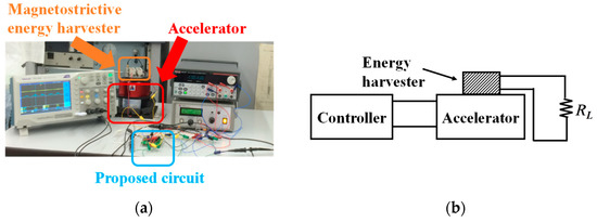The fabricated circuit was validated with magnetostrictive energy transducer, which was developed at Ueno lab [5], as shown in Figure 18a. The size of the transducer is about 3.5 cm × 1 cm × 1 cm. To extract fIN and REH, we directly connected the energy transducer with RL. The acceleration and frequency of the accelerator were controlled by a controller. Figure 18b shows a block diagram of the measurement system. Vibration was applied to the energy transducer to generate an AC voltage across the load resistor RL.