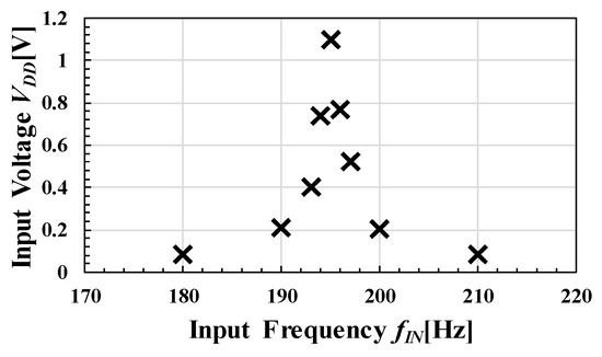 Figure 17 shows the measured results of fIN-. The actual frequency of the vibration was about 10 Hz –1000 Hz, but it was changed from 10 Hz to 100 kHz for theoretical verification. only varied by 3% over such a wide frequency range. Since the conventional circuit shown in Figure 1 operates on the basis of fIN, a change in fIN greatly affects Therefore, it is necessary to adjust the circuit parameters depending on the vibration frequency. On the other hand, the proposed circuit was theoretically expected to be robust against variation in fIN, as shown by Equations (8) and (14). Figure 17 suggests that the proposed circuit has the advantage that even if the frequency of vibration changes with a different energy transducer, the common circuit design can be used, which contributes to cost reduction.