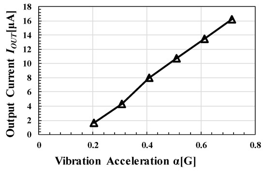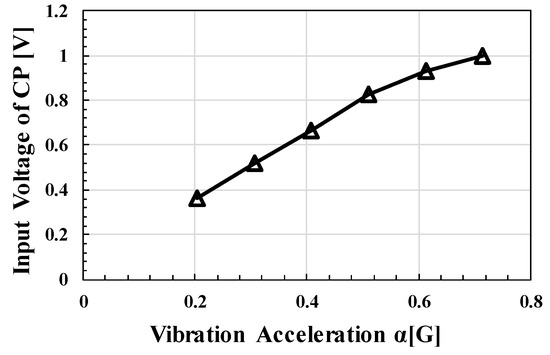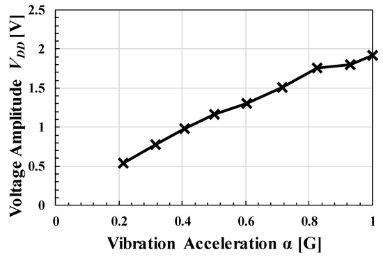 Figure 22 shows fCLK- in terms of α = 0.28 G and α = 0.5 G. The solid and triangular plots show the results of Equation (8) and the simulation values when REH = 1 kΩ, respectively. For both Figure 21a,b, the error rate between the model at fCLK ≤ 2 MHz and the measurement was approximately 11–16%. The error rate between the simulation result and the measurement was 2–9%. It is confirmed that the fabricated clocked AC-DC CP can output power of 1 μW at 2 V with α = 0.28 G at fCLK ≥ 1 MHz. Figure 23 and Figure 24 show the input voltage amplitude of CP and when α was changed. Measurement was performed with fCLK = 5.0 MHz and VOUT = 2 V. In this experiment, a 1 V CMOS transistor was used. Therefore, VDD must be limited up to 1 V. As shown in Figure 23, α was controlled to be below 0.7 G. For production, a clamping circuit must be placed between VREC and GND to limit VREC. Although VDD was about 0.4 V when α = 0.2 G, it was confirmed that the proposed circuit operated to obtain power of 2 μW–30 μW in the range of α = 0.2 G to 0.7 G.
