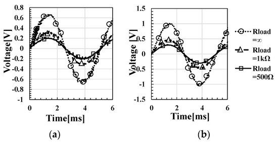 As shown in Figure 19, the resonant frequency was determined to be 195 Hz. In the subsequent verification, fIN was fixed at 195 Hz. Figure 20 shows VDD across vibration acceleration α when RL = ∞. It can be confirmed that VDD was proportional to α. Figure 21a,b show, respectively, the output voltage when α = 0.28 G (a) and 0.5 G (b). The data indicate that the effective output resistance of the transducer was about 1 kΩ. The measured waveform validated the assumption that the magnetostrictive energy transducer can be modeled by the AC voltage source and the output impedance, as shown in Figure 3, as long as the load resistance RL is relatively high. Accordingly, as the output power increased, there could be significant interaction between the mechanical and electrical characteristics, as described in [22]. In such a case, the model of the transducer would need to be modified.