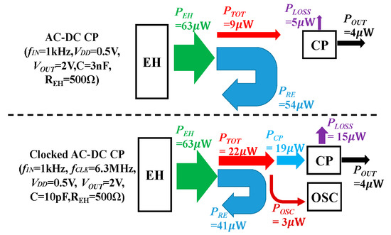A comparison of the power distribution between the AC-DC CP and the proposed circuit was estimated for POUT of 4 μW, as shown in Figure 26. PEH was calculated from Equation (16). PRE is reactive power and PLOSS is the power consumed by the CP. Compared with the AC-DC CP, the proposed circuit requires more power for OSC. In addition, the power loss due to the parasitic elements increased due to higher clock frequency. However, all the additional power is converted from PRE. Therefore, the proposed circuit can have a higher power factor than the AC-DC CP.