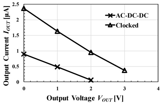 Figure 28 shows that of the AC-DC-DC CP with N diodes started to flow at VDD = 0.5 V, whereas the proposed circuit can operate at VDD = 0.3 V. In the case of AC-DC-DC CP, when VDD < 0.5 V, the voltage becomes lower than the threshold voltage of the MOS transistor, and thus it cannot operate. To have POUT ≥ 1 μW, the AC-DC-DC CP requires VDD of 0.6 V, whereas the clocked AC-DC CP requires that of 0.4 V. As a result, a cold start voltage can be reduced with the clocked AC-DC CP in comparison with the AC-DC-DC CP. In the range of VDD > 1 V, if process technology allows, the conventional circuit exceeds of the proposed circuit. Since the input voltage of the proposed circuit is AC, CP and OSC operate only in a part of one half cycle, i.e., from θS to π – θS. On the other hand, the conventional DC-DC CP continues to be driven by a clock with a constant voltage amplitude. Therefore, when the VDD of the conventional circuit becomes sufficiently high, higher is obtained.