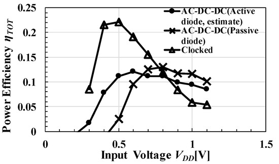 Figure 29 shows simulated ηTOT. The clocked AC-DC CP had the highest ηTOT of 22% at VDD of 0.5 V, while the AC-DC-DC CP had ηTOT of 18% at VDD of 0.8 V. The clocked AC-DC CP had a lower operation voltage than the AC-DC-DC CP did in terms of ηTOT as well as . Previous studies [9,10] have reported AC-DC conversion with active diodes that can reduce the voltage drop due to the diode threshold voltage, as shown in Figure 4b. The comparator compared the magnitude of VREC with that of VDD. When VREC became lower than VDD, PMOS was turned on with the low gate voltage and CREC was charged. Figure 28 and Figure 29 respectively show and ηTOT of the AC-DC-DC CP, which were estimated by assuming VTHD = 0 V when the active diode was used. The input power of the operational amplifier was assumed to be 1 μW. In the range of VDD ≥ 0.5 V, AC-DC-DC CP with active diodes provided higher than the proposed circuit. Because the input power of the operational amplifier was required, ηTOT became lower in the circuits with active diodes. In order to operate the operational amplifier, it is necessary to provide a power source. If VREC is used as the power source for the operational amplifier, a passive diode must be connected in parallel with the active diode for cold start. Thus, the proposed AC-DC CP can have a lower cold start voltage than AC-DC-DC CPs with a lower number of discrete components.