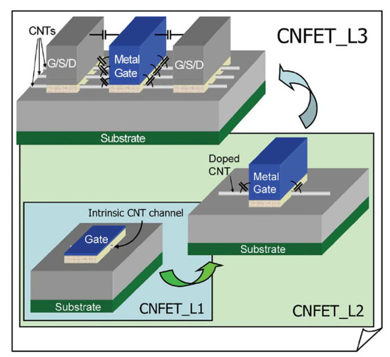 - Bishop, M.; Hills, G.; Srimani, T.; Lau, C.; Murphy, D.; Fuller, S.; Humes, J.; Ratkovich, A.; Nelson, M.; Shulaker, M. Fabrication of carbon nanotube field-effect transistors in commercial silicon manufacturing facilities. Nat. Electron. 2020, 3, 492–501. [Google Scholar] [CrossRef]