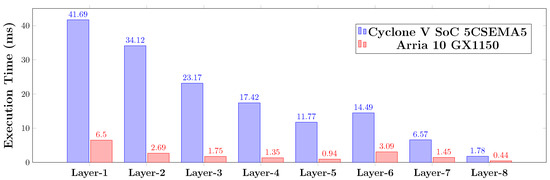 Table 1 shows the execution times of AlexNet [38] and VGG-16 [39] for three platforms while using CNN2Gate. The user can verify the CNN model on CPU using the CNN2Gate emulation mode in order to confirm the resulting numerical accuracy, as mentioned before. Even if the execution time is rather large, this is a very useful feature to let the developer verify the validity of the CNN design on the target hardware before going forward for synthesis, which is a very time-consuming process. Note that the emulation’s execution time cannot be a reference for the throughput performance of a core-i7 processor. The emulation mode only serves the purpose of verifying the OpenCL kernels operations. In [40], the authors described the execution of AlexNet on desktop CPUs and reported an execution time as low as 2.15 s. The reported results also show the scalability of this design Indeed, the results are reported for both the low cost Cyclone V SoC and the much more expensive Arria 10 FPGA that has much more resources. The exploited level of parallelism was automatically extended by the design-space exploration algorithm in order to obtain better results for execution times that are commensurate with the capacity of the hardware platform.