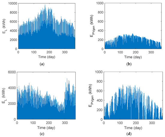 Bar graphs for cumulative daily consumption and photovoltaic generation (kWh/day) corresponding to industry A and B throughout a year (365 bars). (a) Industry A-Daily consumption data; (b) Industry A-Daily generation data; (c) Industry B-Daily consumption data; (d) Industry B-Daily generation data.