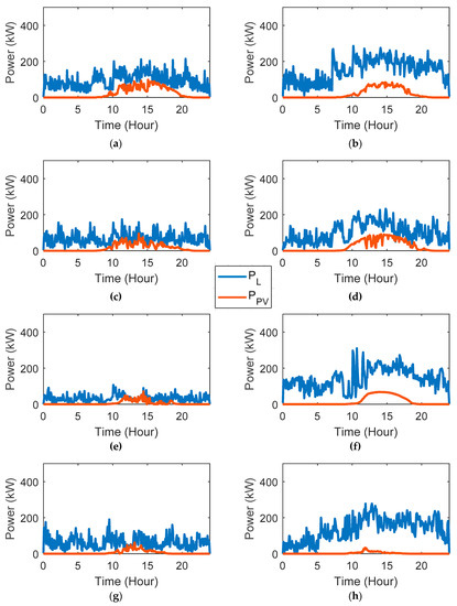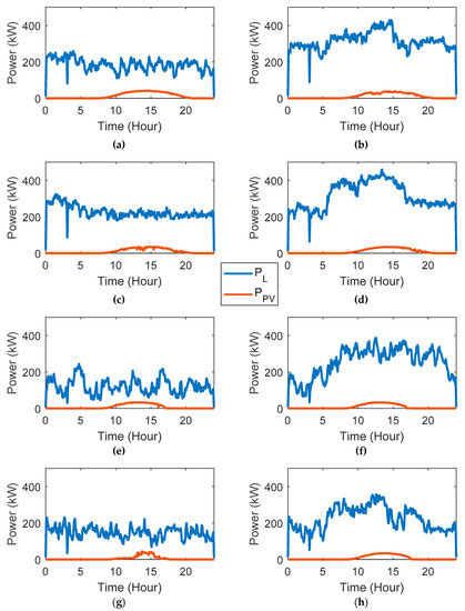 Daily load and photovoltaic generation profiles. Industry A. (a) Weekend-May 6; (b) Labor Day-May 4; (c) Weekend-August 6; (d) Labor Day-August 7; (e) Weekend-November 5; (f) Labor Day-November 6; (g) Weekend-February 4; (h) Labor Day-February 6.
