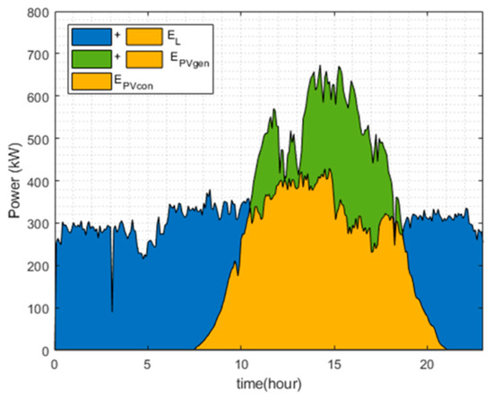 Daily load and photovoltaic generation profiles. Load consumption (blue + orange areas), EL, photovoltaic generation (orange + green areas), EPV,gen, and photovoltaic self-consumed energy (orange area), EPV,con.