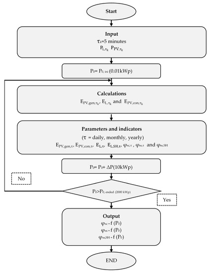 where is the photovoltaic power for the photovoltaic self-consumption system for each k period, is the recording period, P0 (kW) is the rated power, (p.u) is the per-unit PV power output at each k period which is irradiance function, ambient temperature and photovoltaic system efficiency [30]. These simplifies expressions have been used in other similar studies [31,32]. In this way, a range of P0 from 0.01 kWp to 2 MWp was used with a step of 10 kWp. The upper limit has been chosen in order to properly plot the aforementioned curves.