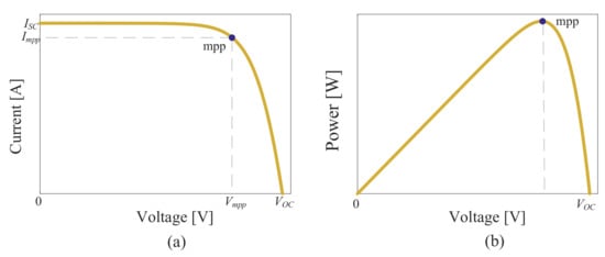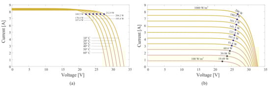 where and the temperature coefficients for open-circuit voltage and the short-circuit current, respectively. The temperature of the standard test conditions (STCs) is given by . The open-circuit voltage and short-circuit current are measured in the STCs. The effect of solar irradiation on the short-circuit current can be characterized by: