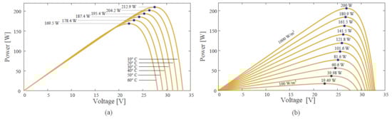 The P-V under variable conditions: (a) Under different temperature degrees. (b) Under different solar irradiance levels.
