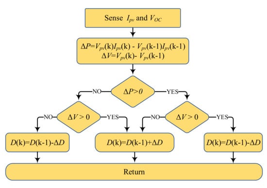 The variation in solar irradiance and temperature values makes variable. Therefore, a tracker is needed to allow a PV panel to operate at and extract the maximum power. Many approaches have been introduced to track the MPP. The commonly used technique in the solar industry is the P&O because of the reasonable trade-off between simplicity and performance. The P&O approach flowchart is seen in Figure 5. This approach perturbs the duty cycle and observes the power if it increases or decreases. Then, a step-change to the duty cycle takes place. The step-change determines the conversion speed and accuracy. P&O with a large step-change lacks accuracy and might experience instability issues. Making the step-change small reduces the conversion speeds, lacks speed, and might perform poorly at fast transitioning solar irradiance. The adaptive step can be applied, but without the guarantee of stable operation [,,,]. Similarly, hill-climbing and incremental conductance have similar performance to P&O, with no significant advantages. The ripple correlation control approach takes advantage of ripples imposed by switching devices on the PV panel [,]. In RCC, the derivative of the voltage is multiplied by the derivative of the power. If the product is zero, then the PV operates at its maximum power point. If the product is higher or lower than the MPP, then the PV operates on the left or the right of the MPP, respectively. The drawback of using RCC is the required multiplied devices, which are power-consuming devices.