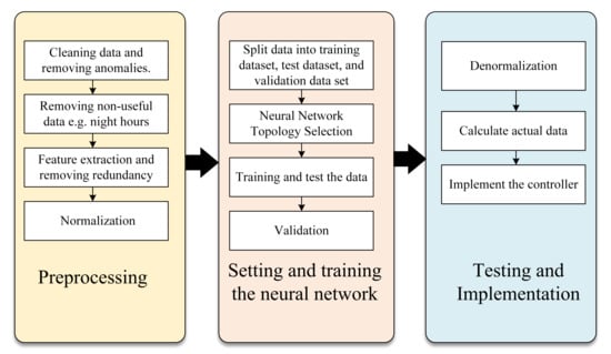 The setup has three stages; preprocessing, setting and training the neural network, and implementation and testing. Figure 8 shows the stages of implementing the controller.