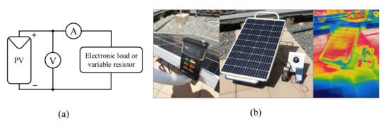 The approach used to produce the dataset for neural network training: (a) schematic diagram of the circuit (b) experimental setup. The electronic load used to sweep the voltage and get the I-V characteristic curve at specific irradiance and temperature values.