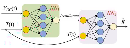 The two neural networks used in training: used to approximate the relationship between the open-circuit voltage and the solar irradiance under variable temperature values, and used to map the relationship between the irradiance and fractional open-circuit factor.