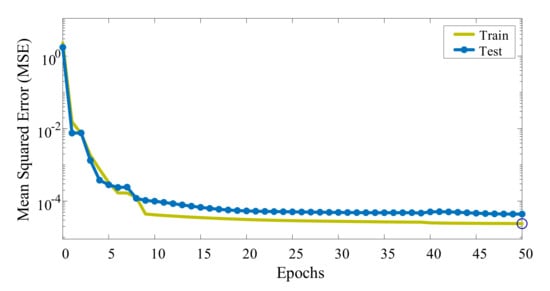 After selecting the topology, the weight is randomized, and the hyperparameters are set. Both networks are trained using the Levenberg–Marquardt backpropagation algorithm [] to update the weight. The training took about 50 epochs to reach the goal set, a low mean squared error (MSE).