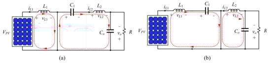 The subintervals in continuous conduction mode. (a) is when the active switch is ON; (b) is the when the active switch is OFF.