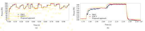In this case, the output load and temperature are assumed constant for two reasons. First, the relationship between the output power and solar irradiance is stronger than the relationship between the output load and temperature, which gives an acceptable estimation of the tracking algorithm’s performance if the temperature value is constant. Second, all algorithms need an ideal test, where the load is constant to find their best performance. Figure 14 shows the performance of the algorithms under the variation of solar irradiance. The proposed method outperforms the P&O algorithm in terms of accuracy and can reach the MPP faster. P&O oscillates around the MPP without reaching the exact MPP. The FOCV method has a similar dynamic performance to the proposed method. However, the accuracy of the FOCV is less than the proposed method.