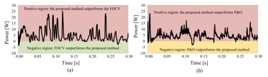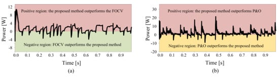 Figure 15 shows a new way to compare the performance of the two algorithms. Therefore in Figure 15a, the power difference between the FOCV and the proposed method is shown to indicated positive and negative regions. The positive region is when the difference in power is higher than zero, which indicates that the power produced using the proposed method is higher than the power produced using the FOCV. The negative region is when the difference in power is less than zero and indicates that the FOCV performs better. The comparison with P&O is shown in Figure 15b.