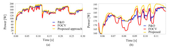This case simulates a more realistic situation, where the temperature and irradiance vary. The output power, in this case, is shown in Figure 16. It can be seen that the proposed method exhibits faster dynamic speed and higher accuracy than the other methods. The varying temperature greatly degrades the performance of the FOCV since the open-circuit voltage depends on it. P&O is also affected by the temperature variation. However, since the P&O algorithm is independent of the panel information, the accuracy is higher than the FOCV method. The proposed method is faster during transitions from one irradiance level to another.