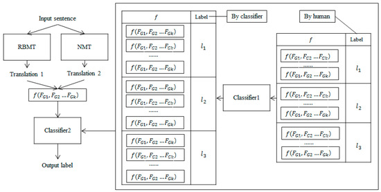 The first step is manually constructing the training data for the hybrid classifier. A set of source sentences are provided with the automatic translation results and the extracted features from RBMT and NMT. Human translators evaluate the quality of each translation result with a score (from 0 to 4 points) following the criteria shown in Table 2, which was revised from preliminary works [5,35]. Based on the human-estimated scores, each sentence is labeled with “NMT” (indicating that the NMT result is better), “RBMT” (indicating that the RBMT result is better), or “Equal”. The extracted labeled features comprise the training corpus for classification.