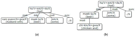 Case particles in Korean are often omitted, which causes case ambiguities among the subjective, vocative, and objective cases. The particles “-wa/-gwa”, which mean ‘with’ or ‘and’ in English, cause syntactic ambiguities when they are used to connect two nouns. Below are two examples where the syntactic structures are determined by the word semantics (see (a) and (b) in Figure 2). In this case, there are analysis ambiguities, because word semantics are not considered during analysis.
