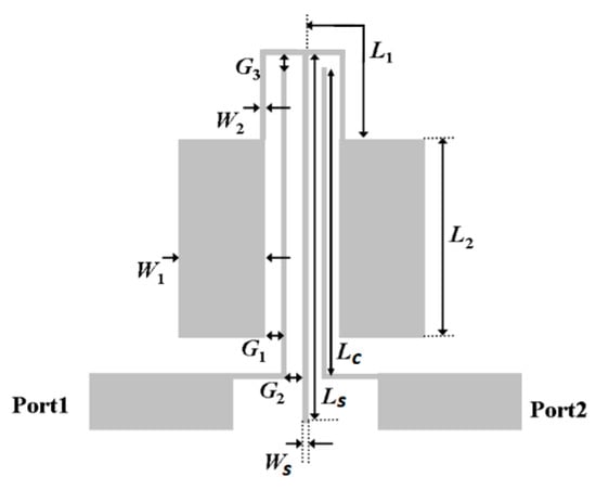 The proposed filter has the advantage of the appearance of the transmission zeros, which are produced by the open stub (Ls) and the coupling length (Lc) of the I/O lines. The length of the open stub is represented as Ls, and the length of the coupling surface is represented as Lc. The transmission zeros of the filter generated by the Ls is expressed as [29]