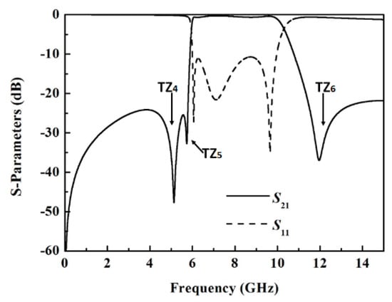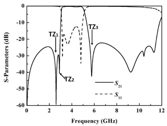 where f0 is the center frequency and is the guided wavelength corresponding to the center frequency. With Ls = 13.7 mm and Lc = 11.9 mm, the expected transmission zeros are calculated to be 2.48 GHz (TZ1) by using Equation (4), and the transmission zeros are determined to be 2.90 GHz (TZ2) and 5.95 GHz by (TZ3) using Equation (5). The passband edge has three transmission zeros, making a good band selectivity, as shown in Figure 4.