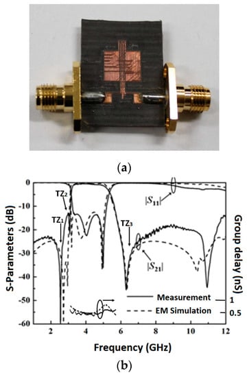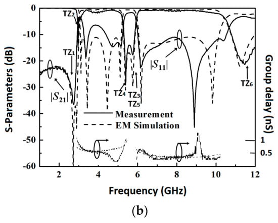 Figure 5a shows a photograph of the fabricated BPF. The overall size of this BPF is about 10 mm × 20 mm, around 0.15 × 0.25 , where is the guided wavelength at the center frequency. Figure 5b displays the simulated and measured results of the designed UWB BPF with a wide stopband. For the measurement, an HP 8510C network analyzer was used after first being calibrated. The measured results have average insertion loss |S21| of 0.94 dB, average return loss |S11| of 16.2 dB and 3-dB fractional bandwidth (FBW) = 52.7%. The transmission zeros appeared near the passband at 2.5 GHz (TZ1), 2.95 GHz (TZ2) and 6.1 GHz (TZ3), thus having a high isolation. The measured group delay has a small varying range from 0.2 ns to 0.4 ns. Although the simulated results and the measured results have a slight mismatch in the high frequency region, this is typically caused due to the material limitation of the substrate. The filter has a simple structure and good filter features, thus it has a good potential to be applied in UWB applications.