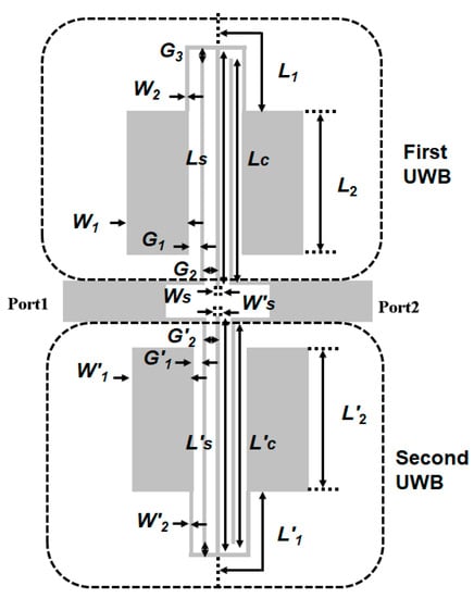 The first UWB response is set from 3.1 to 5 GHz with a stopband from 5.5 to >11 GHz, as in Section 3. The designed UWB BPF with a wide stopband is optimized using the EM simulation [30] and the dimension parameters are shown in Figure 4. The simulated results have a wide stopband with an attenuation is larger than 20 dB from 5.9 to 12 GHz, as shown in Figure 4. Therefore, the second UWB response can be designed in the wide stopband region of the first UWB response.