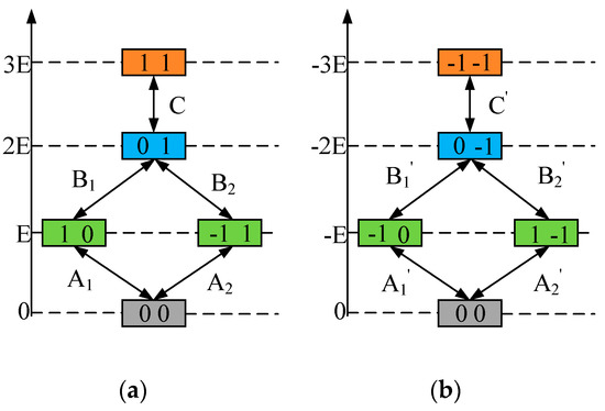 According to the operating principle of the inverter, each cascade unit can output three different levels of voltage. For high-voltage unit H1, uH1 can output +2E, −2E, and 0, and for low voltage-unit H2, uH2 can output +E, −E, and 0. Therefore, the output phase voltage of the inverters can reach 7 levels, which are (+3E), (+2E), (+E), and 0, respectively. Suppose that the switching function of unit i (i = 1, 2) is: