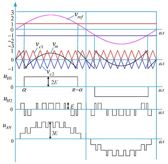 The state of cascaded inverter and output voltage levels of each unit is represented by (S1, S2). The output voltage levels of each unit are shown in Equation (3) and the total output voltage levels of cascaded inverters are shown in Equation (4). As it can be seen from the synthesis method of PWM levels in each interval in Figure 2 that when different PWM synthesis methods are selected, the output waveforms of different PWM levels will be corresponding, so that the output voltage waveforms of all levels of joint units are different. In the following, the positive half cycle is taken as an example to elaborate the synthesis method of PWM level in each interval.