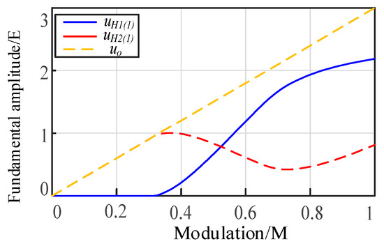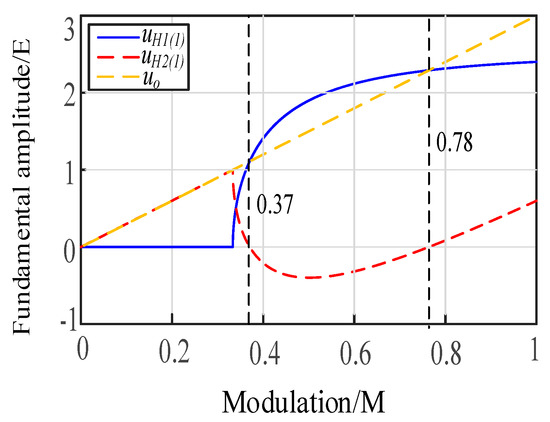 where, M is the modulation index, uH1(1) and uH2(1) are the fundamental amplitude of high-voltage unit H1 and low-voltage unit H2 output voltage respectively, and uAN(1) is the fundamental amplitude of the output phase voltage of the inverter. The relationship between the fundamental amplitude of three voltages and the modulation M is shown in Figure 4. It can be seen that when M is in the interval [0, 1/3], the output voltage of H1 is 0, and the output power of the inverter is all borne by H2. When M is located in the interval [0.37, 0.78], the polarity of the output voltage of the two units is opposite. High-voltage unit H1 injects energy into low-voltage unit H2, resulting in the problem of current back-filling and energy back-flow. At this moment, uh1 is larger than uAN, uH2 is less than 0, therefore the output power of H1 unit exceeds the requirement of load and affects the stability of DC bus capacitor voltage.
